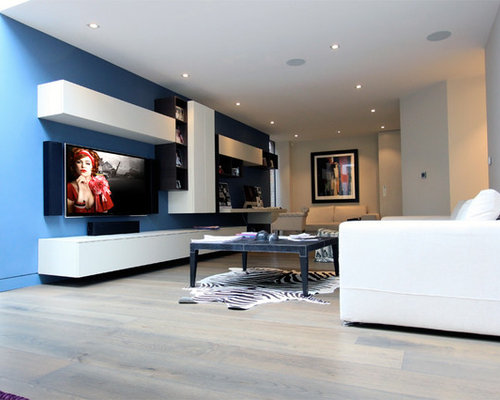 | Design ideas for a contemporary living room with a standard fireplace and a wall-mounted tv |